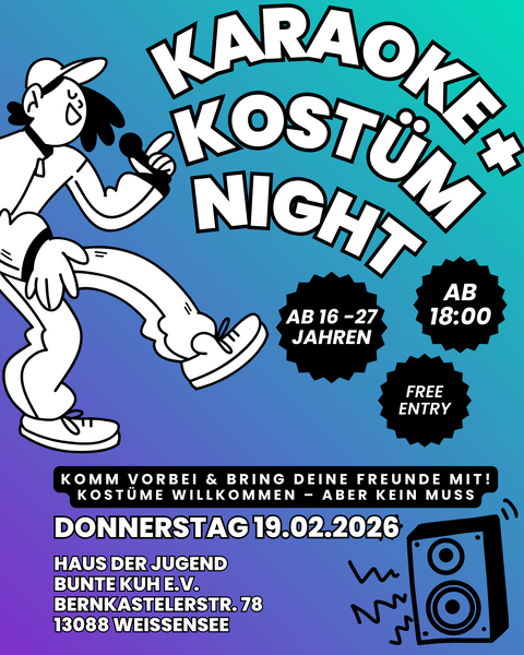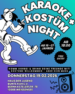 Wir laden euch herzlich zu unserem Kostüm-Karaoke-Abend ein! Er findet am 19.02.2026 ab 18 Uhr statt. Bringt gerne eure Freund*innen mit. Der Abend ist für 16 bis 27 Jahre