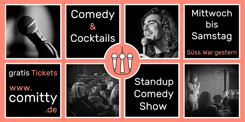 ⭐ COMITTY – Comedy & Cocktails – jeden Freitag & Samstag: • 18:30 Uhr: Comedy Show mit handverlesenen Comedians • In der Bar "Süss war gestern" (Eintritt ab 18 Jahren), Wühlischstr. 43, Berlin-Friedrichshain • Freier Eintritt (Spende erwünscht, Vorschlag: 5-10 €)