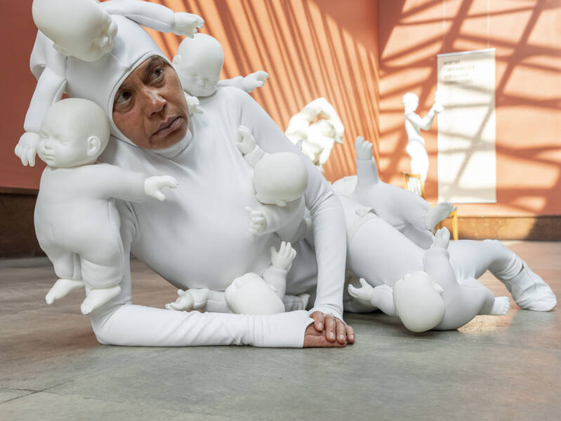 Sie lebte vor schätzungsweise 150.000 bis 200.000 Jahren, vermutlich in Äthiopien. Über ihre mitochondriale DNA (mtDNA), die ausschließlich von der Mutter an Kinder weitergegeben wird, ist sie genetisch mit der gesamten heutigen Menschheit verbunden.Im Humboldt Forum, umgeben von den Blicken der Ahnengalerie der Kurfürsten und der unlängst mit KI dazu generierten Kurfürstinnen im 3. Obergeschoss, entfaltet die auf den Philippinen geborene und in Dänemark lebende Lilibeth Cuenca Rasmussen ihre Performance über Mutterschaft, Wahlfreiheit sowie die körperliche und emotionale Auseinandersetzung mit Babys und Kindern. In einem weißen, skulpturalen Kostüm – inspiriert von Kai Nielsens Skulptur “Mother of Water” und überwachsen mit Babyfiguren – begleitet von Vojta Drnek’s Akkordeon sowie Text und interaktiven Momenten, zeigt sie, wie Kinder den Körper der Mutter beanspruchen, fordern und formen – und wie sich darin Ambivalenz, Erschöpfung, Nähe und Selbstbestimmung verweben.