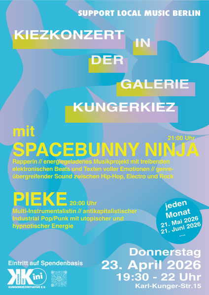 19:30 Uhr: Einlass & Öffnung der Bar 20 Uhr: PIEKE 21 Uhr: Spacebunny Ninja