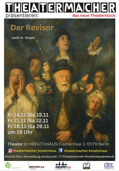 Der Revisor – eine Komödie nach Nikolai Gogol Inszenierung der Theatermacher. Ein kleiner Ort irgendwo im Nirgendwo gerät aus den Fugen: Die Nachricht verbreitet sich, dass ein hoher Beamter aus der Hauptstadt heimlich unterwegs ist, um die Stadt zu prüfen. Plötzlich ist alles anders – Beamte geraten in Panik, Akten werden geschönt, Gesichter poliert und Lügen kunstvoll verpackt. Doch wer ist dieser geheimnisvolle Revisor wirklich? Mit bissigem Humor, scharfer Beobachtung und zeitloser Aktualität zeigt Gogols Komödie die große Angst vor Kontrolle – und die noch größere vor der Wahrheit. Ein Spiegelbild menschlicher Schwächen, urkomisch und entlarvend zugleich. Lustig, absurd, entlarvend – „Der Revisor“ bleibt eine satirische Meisterleistung über Macht, Korruption und die Kunst, sich selbst zu täuschen.