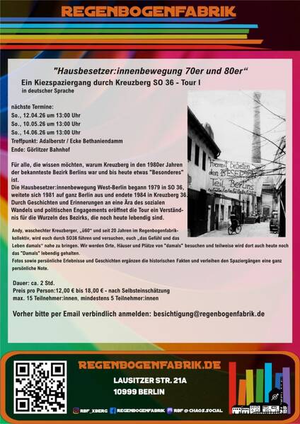 Andy, waschechter Kreuzberger, „ü60“ und seit 20 Jahren im Regenbogenfabrikkollektiv, wird euch durch SO36 führen und versuchen, euch „das Gefühl und das Leben damals“ nahe zu bringen. Wir werden Orte, Häuser und Plätze von „damals“ besuchen und teilweise wird dort auch heute noch das „Damals“ lebendig gehalten.