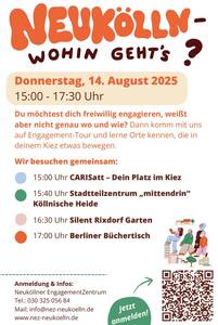 Am Donnerstag, den 14. August 2025, lädt das Neuköllner EngagementZentrum von 15:00 bis 17:30 Uhr zu einer besonderen Tour ein: „Neukölln – Wohin geht’s?“. Die Veranstaltung richtet sich an alle, die Lust haben, sich freiwillig zu engagieren, aber noch nicht genau wissen, wo und wie sie starten können. Gemeinsam besuchen wir vier inspirierende Orte im Kiez, die zeigen, wie vielfältig Engagement in Neukölln sein kann.