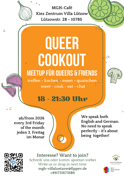 Queer Cookout ist eine offene Gruppe von uns für Queer & Friends. Wir treffen uns jeden 3. Freitag im Monat im Kiez Zentrum Villa Lützow (Lützowstr. 28), um gemeinsam einen schönen gemütlichen Freitagabend zu verbringen. Wir treffen uns um 18 Uhr, um das vegetarische/vegane essen vorzubereiten. Kommt gerne beim nächsten Abendessen! Anmeldung/Fragen gerne formlos an: mgh-villaluetzow@fippev.de