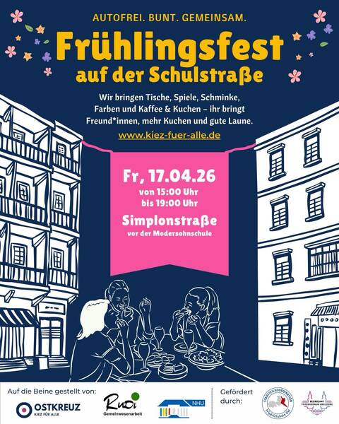 m 17. April planen wir ein großes Frühlingsfest auf der Simplonstraße — in der neuen Schulzone vor der Modersohn-Grundschule. Das Fest soll ein offener Treffpunkt für Familien, Nachbar*innen und alle Interessierten werden.