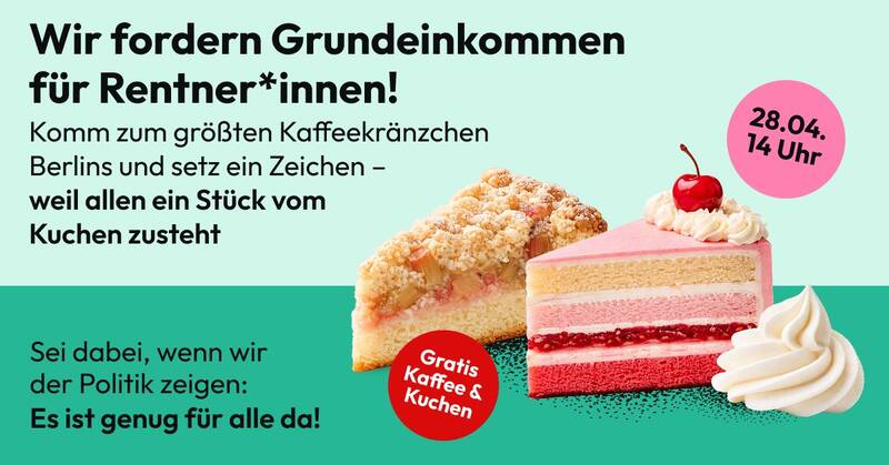 Das größte Kaffeekränzchen Deutschlands für ein Bedingungsloses Grundeinkommen für Rentner*innen, mit Gratis Kaffee & Kuchen:
