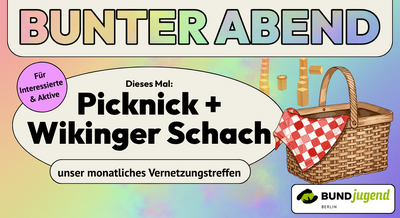 Am 07. Mai 2026 um 17 Uhr laden wir Dich zu unserem Bunten Abend ein. (Bitte nur Menschen unter 27.) Bei gutem Wetter machen wir uns von der BUNDjugend Berlin (Erich-Weinert-Straße 82) um 17:15 gemeinsam auf den Weg zum Humannplatz zum Picknicken und Wikingerschach spielen und bei regnerischem Wetter bleiben wir einfach in unserem kuscheligen Büro mit gutem Essen und schauen einen Film. Komm gerne vorbei!