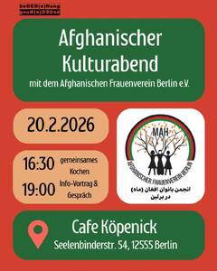 Der Afghanische Frauenverein Berlin e.V. lädt zum gemeinsamen Kochen, interkulturellem Austausch und Vortrag ein.