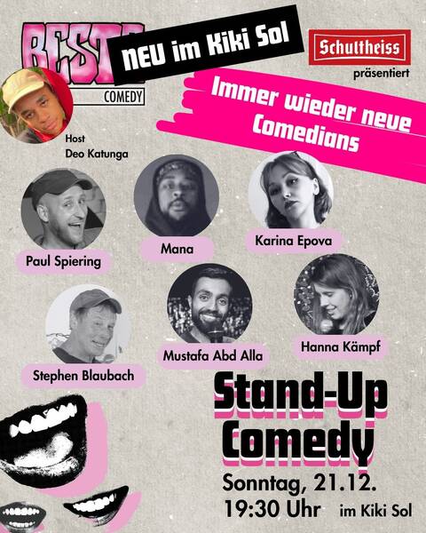 Kommt rum! Im Kiki Sol könnt ihr einen unvergessenen Abend bei BESTE Comedy erleben! Mit dabei sind dieses Mal Karina Epova, MANA, Stephen Blaubach, Paul Spiering, Hanna Kämpf und Mustafa Abd Alla. Wie immer wird BESTE Comedy unterstützt von Schultheiss. Gehosted wird die Show von Deo Katunga! Für kostenlose Tickets einfach auf den Link klicken.
