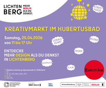 Hereinspaziert zum 2. Kreativmarkt im Hubertusbad! Am 25. April wird aus Lichtenbergs ehrwürdigem Stadtbad ein lebendiger Treffpunkt für Kreativität, Stil und Community: Tauche ein in den zweiten Design- und Kreativmarkt und entdecke, was die kreative Szene aus Lichtenberg und Friedrichshain-Kreuzberg zu bieten hat! Ob einzigartige Kunststücke, edles Handwerk oder frische Designideen: In der atemberaubenden Kulisse der alten Schwimmhalle gibt es viel zu bestaunen und zu erleben. Musik vom DJ sorgt für gute Laune, Streetfood und kühle Drinks stillen jeden Hunger auf Genuss und Inspiration. Du willst neue Lieblingsstücke finden, dich überraschen lassen oder einfach den Flow genießen? Dann bist du hier genau richtig! Der Markt ist ein Gemeinschaftsprojekt der Wirtschaftsförderungen Lichtenberg und Friedrichshain-Kreuzberg – ein Highlight, das du nicht verpassen solltest. Samstag, 25. April 2026, 11–17 Uhr im Hubertusbad, Hubertusstraße 47–49. Eintritt frei!