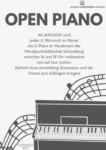 Jeden 2. Mittwoch im Monat darf unser E-Piano ohne Kopfhörer im Musikraum oder im Foyer der Mittelpunktbibliothek Schöneberg zwischen 16 und 18 Uhr lustvoll von Jung & Alt zum Klingen gebracht werden. Es steht vorbereitet zur freien Nutzung ohne Anmeldung zur Verfügung. Einfach loslegen. Viel Freude beim Musizieren!