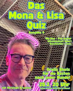 Nach jeder Runde geben wir eine Runde Shots aus! Nach wieder mal vollem Haus beim letzten Mal ist unser Quiz wieder am Start. Hier gibt es kostenlose Tickets für unser Mona & Lisa-Quiz mit vertrackten Fragen rundum euer Allgemeinwissen. Bitte meldet Euch vorab mit eurem Team (max. 6 Personen) an. Klickt einfach hier unten auf den Link. Wie jedes Mal winlken wieder tolle Preise! Beginn 20 Uhr. Seid rechtzeitig da. Jeder geht schlauer, als er oder sie gekommen ist. Versprochen! Wir freuen uns auf euch!