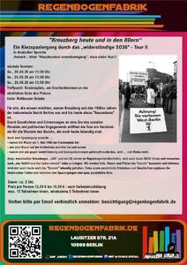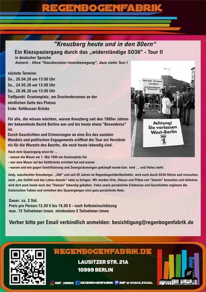 Andy, waschechter Kreuzberger, „ü60“ und seit 20 Jahren im Regenbogenfabrikkollektiv, wird euch durch SO36 führen und versuchen, euch „das Gefühl und das Leben damals“ nahe zu bringen.