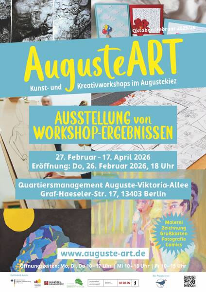 Am Donnerstag, 26. Februar, um 18 Uhr wird im Quartiersbüro (Graf-Haeseler-Str. 17, 13403 Berlin) eine Ausstellung eröffnet. Es werden Malerei, Zeichnung, Comic und Fotografie aus unterschiedlichen Workshops seit dem Herbst 2025 gezeigt. Der Eintritt ist frei.