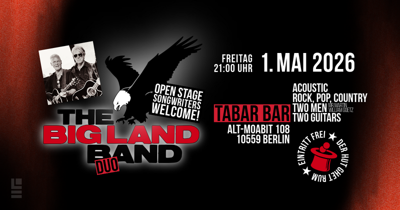 Acoustic Rock, Pop, Country live mit den »Big Land« Men William Goetz (guit/voc) und Mr. Martin (guit/voc) in der "TABAR BAR" Berlin-Tiergarten, Spontan-Programm nach Lust und Laune plus Open Stage - Songwriters welcome - ab 21:00 Uhr, Eintritt frei, have a good time!