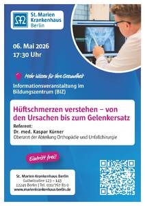 Am 06.05.2026 findet das nächste Patientenforum zum Thema "Hüftschmerzen verstehen – von den Ursachen bis zum Gelenkersatz" statt. 17:30 Uhr im Bildungszentrum (BIZ) des St. Marien-Krankenhauses Berlin.