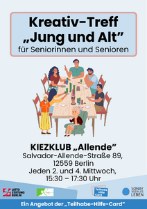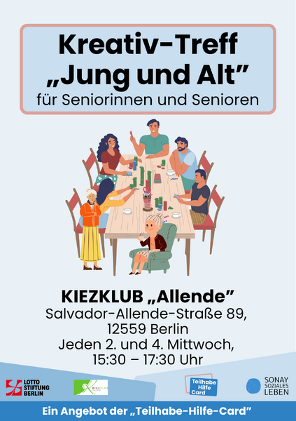 Bei diesem Angebot laden zwei Jugendliche regelmäßig zum Kreativtreff ein. Von Malen und Zeichnen bis zum Kerzen gestalten ist jegliches dabei. Verschiedene Angebote und Materialien sind vor Ort. Schauen Sie doch gern vorbei! Das Angebot findet jeden zweiten und vierten Mittwoch im Monat statt von 15:30 bis 17:30 in der Salvador-Allende-Straße 89, 12559 Berlin.