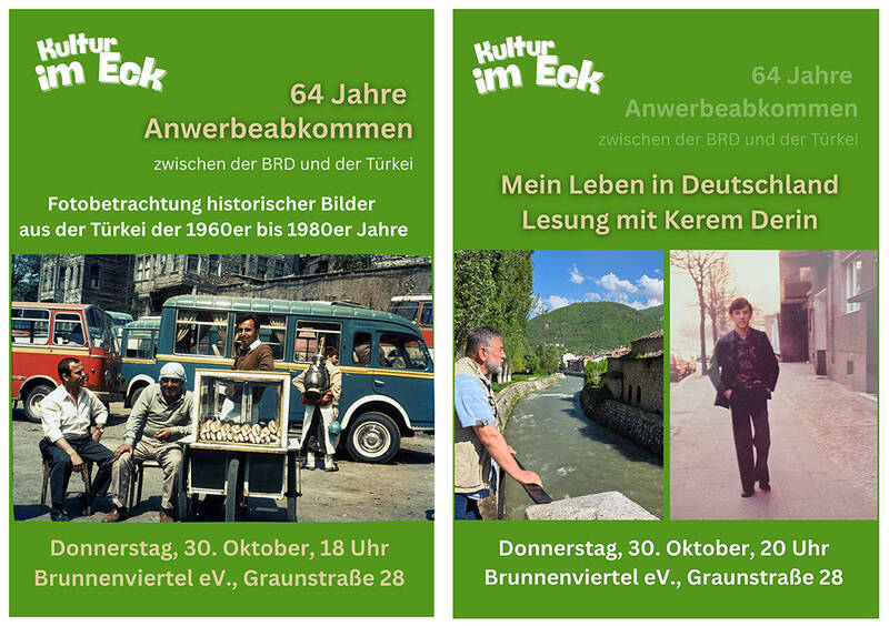 Der Brunnenviertel e.V. lädt am Donnerstag, den 30. Oktober, zu einem türkischen Abend ein. Im Vereinseck in der Graunstraße 28 werden ab 18 Uhr Bilder aus der Türkei der 1960er und 1980er Jahre gezeigt. Im Anschluss liest Kerem Derin, Sohn eines türkischen Gastarbeiters, Gedichte über sein Leben in Deutschland.