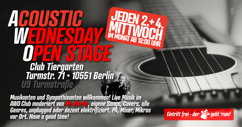 Musikanten & Sympathisanten willkommen! Der Open Stage Abend im AWO Club Tiergarten, moderiert von Mr. Martin, jeden 2. und 4. Mittwoch im Monat ab 18 Uhr, eigene Songs, Covers, alle Genres, unplugged oder dezent elektrifiziert. PA, Mixer, Mikros vor Ort. Der Eintritt ist frei, have a good time!