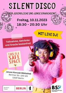 Bei einer Silent Disco hören Teilnehmer*innen die Musik statt über Lautsprecheranlagen über bereitgestellte Funk-Kopfhörer. Ungestört und ohne dabei andere zu stören, kann so nach Herzenslust getanzt und gefeiert werden. Ein Live DJ spielt für alle Party-Begeisterten am 10.11.2023 ab 18:30 im Veranstaltungsraum der Janusz-Korczak-Bibliothek. Eintritt frei, Getränke und kleine Snacks werden gestellt. Veranstaltungsort: Janusz-Korczak-Bibliothek Berliner Straße 120-121 13187 Berlin