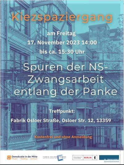 Bei dem Spaziergang begeben wir uns auf die Spuren der Zwangsarbeit im Soldiner Kiez. Entlang der Panke suchen wir Orte auf, an denen heute kaum etwas an die Verbrechen im Nationalsozialismus erinnert. Die Tour beginnt im soziokulturellen Zentrum Fabrik Osloer Straße und endet an der S-Bahn Wollankstr.Anschließend laden wir Sie herzlich zum Austauschen und Aufwärmen auf einen Tee ein.Treffpunkt: Fabrik Osloer Straße, Osloer Straße 12, 13359 Kostenfrei und ohne Anmeldung