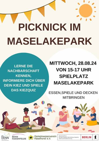 Herzliche Einladung zum gemeinsamen Picknick im Maselakepark neben dem Spielplatz am 28.08. von 15- 17 Uhr. Lernt die Nachbarschaft kennen, informiert euch über den Kiez und spielt das Kiezquiz. Essen, Spiele und Decken gerne selber mitbringen. Das mobile Team des Gemeinwesenvereins Haselhorst e.V./Stadtteilladen Hakenfelde und BENN Hakenfelde freuen sich auf euch/Sie!