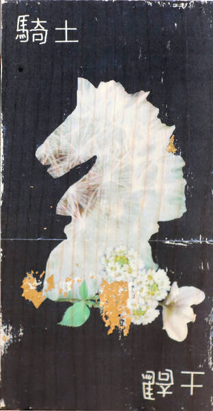 "Ratsu" (The knight / der Springer ), Mariliina Valkama, 2024, image transfer and leaf metal, 39cm x 18.5cm