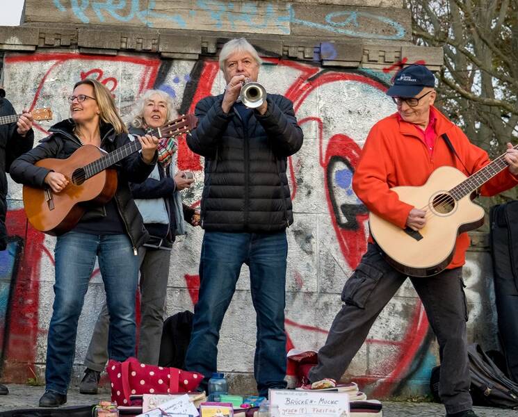 Zur Geschichte der "Brücken-Mucke": Am 24. April 2020, als alle Musiker auf die Straße gespült wurden, weil sie drinnen nicht mehr auftreten durften, trafen sich Burkhard mit seiner Trompete und Gerhild mit ihrer Gitarre zum ersten mal auf der Carl-Zuckmayer-Brücke. Das war der Beginn einer wunderbaren musikalischen Freundschaft! Seitdem rocken wir jeden Freitagnachmittag die Brücke. Sei dabei!