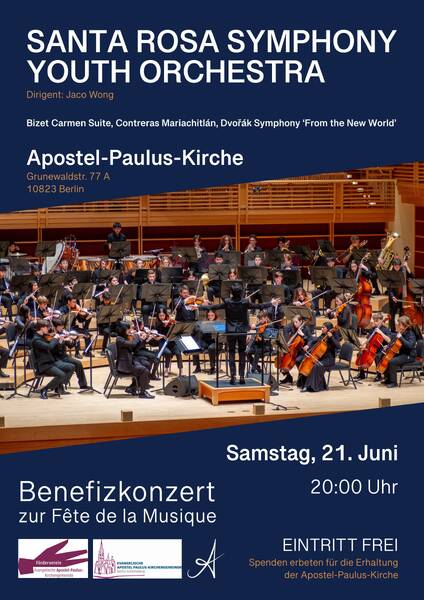 Das Santa Rosa Symphony Youth Orchestra, ausgezeichnet von der Classics Alive Foundation als das "Jugendorchester des Jahres", wird im Rahmen der Fête de la Musique in der Apostel-Paulus-Kirche in Berlin Schöneberg musizieren. Sie bringen ein mitreißendes Programm: Bizet Carmen Suite, Contreras Marichitlán, und Dvořák 9. Sinfonie "Aus der Neuen Welt". Dirigent: Jaco Wong Eintritt frei - Spenden erbeten für die Erhaltung der Apostel-Paulus-Kirche