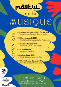 15:30 Uhr – Son de Maracuyá (ECU, CU, BR, DE) – Bolero, Son, Cumbia, Bossa Nova 16:15 Uhr – Katzengewalt (DE) – Ehrliche, therapeutische Popmusik 17:20 Uhr – Luis Perera (CU) – Cuban & Latin Traditional 18:30 Uhr – KaFaNar (TUR) – Oriental Electro 19:30 Uhr – Alícía Jaye & Band (NZ) – RnB, Spoken word hip-hop 21:00 Uhr – Berlin Brass Caravan (DE) – Brass, Klezmer, Ska