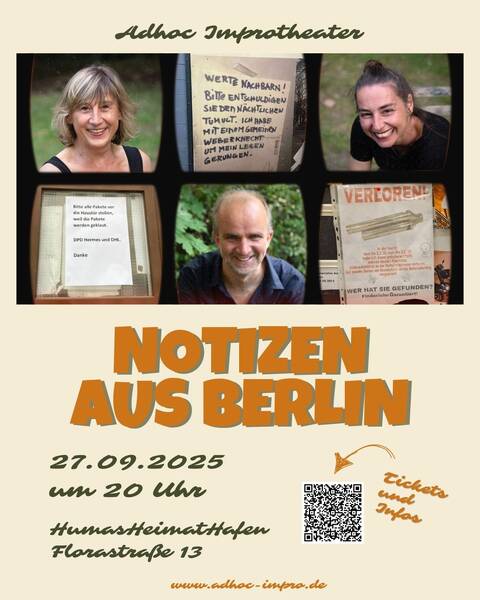 Notizen aus Berlin - Geschichten, die das Großstadtleben schreibt Berlin ist eine Stadt voller Geschichten – manche laut, manche leise, aber alle irgendwie besonders. In unserer neuen Impro-Show lassen wir uns von den Zetteln und Aushängen inspirieren, die überall in der Stadt zu finden sind: „Zu verschenken!“, „Bitte nicht stören!“, „Hundehalter gesucht!“ – Wer und was steckt hinter diesen Mitteilungen? Was passiert mit den Menschen, die sie hinterlassen haben? Wie geht ihre Geschichte weiter? Werden sie das finden, was sie suchen? Oder wird alles ganz anders?Lass Dich von uns entführen und erlebe eine unvergessliche Reise durch Berlin, die Du so noch nie gesehen hast! Sei am 27.09.25 dabei und entdecke in Pankows neuer Location "HumasHeimatHafen" die vielen unbekannten Seiten der Stadt – improvisiert, lebendig und voller Fantasie!