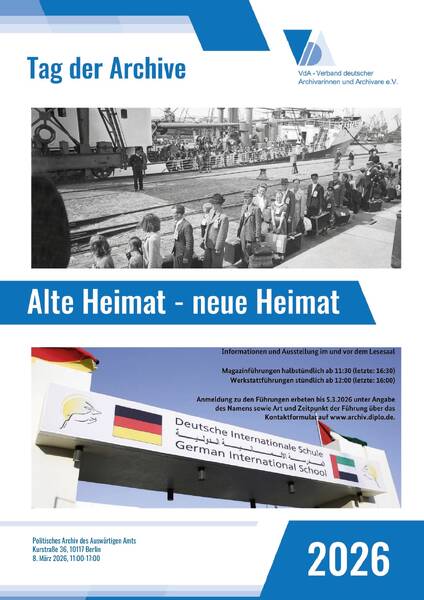 Heimat kann man fühlen, finden - und auch verlieren. Der Heimatbegriff ist individuell und im Duden inzwischen auch im Plural verfügbar. Das Auswärtige Amt war und ist aufgrund seiner Zuständigkeit vielfältig damit befasst, die Rahmenbedingungen für diesen Begriff zu gestalten - für Deutsche im Ausland wie für Einwanderinnen und Einwanderer in Deutschland. Anlässlich des 13. bundesweiten Tags der Archive zeigt das Politische Archiv des Auswärtigen Amts aus seiner Überlieferung unterschiedlichste Beispiele zum Thema „Alte Heimat – Neue Heimat“: Gastarbeiterabkommen, Vertragsarbeiterinnen und Vertragsarbeiter der DDR, Auslandsschulwesen, Flucht und Vertreibung, Aus- und Einbürgerungen. Besucher*innen können unter fachkundiger Anleitung in den Beständen recherchieren, Exponate in Vitrinen anschauen, in ausgesuchten Akten und in Publikationen des Archivs lesen. Außerdem finden Führungen durch die Restaurierungswerkstatt und die Magazine statt. Uhrzeiten Magazine: Alle halbe Stunde ab 11.30 Uhr. Letzte Führung 16:30 Uhr. Uhrzeiten Restaurierungswerkstatt: Zu jeder vollen Stunde ab 12 Uhr. Letzte Führung 16:00 Uhr. Für die Führungen sind Anmeldungen bis zum 05.03.2026 erforderlich. Teilen Sie uns bitte mit, an welcher Führung (Uhrzeit) sie teilnehmen möchten (die Teilnehmerzahl ist auf 20 Personen je Gruppe begrenzt). Wir benötigen den Vor- und Nachnamen der Besuchenden. Nutzen Sie hierfür die Webseite https://archiv.diplo.de/arc-de/das-politische-archiv/kontakt/kontaktformular-registratur. Der Eintritt ist frei, Interessierte benötigen einen Lichtbildausweis und müssen die Sicherheitskontrolle passieren. Sollten Sie eine barrierefreie Führung benötigen, bitten wir Sie uns dies im Vorfeld mitzuteilen. Wir freuen uns auf Ihren Besuch.
