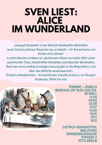 In acht Abenden erleben wir gemeinsam Alices verrückte Welt voller sprechender Tiere, rätselhafter Gestalten und absurder Weisheiten. Nach der etwa dreißig-minütigen Lesung gibt es die Möglichkeit, sich über das Gehörte auszutauschen.