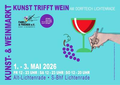 Vom 1. bis 3. Mai 2026 lädt der jährliche Weinfrühling rund um den idyllischen Dorfteich in Lichtenrade wieder zu einem genussvollen Wochenende mit Kunst, Wein, Kulinarik und lebendiger Live-Musik ein. Kunst, Kunsthandwerk, Manufakturen und Winzer locken drei Tage lang mit edlen Weinen, zartschmelzenden Schokoladen, regionalen Honigen, knusprigen Broten oder anderen Köstlichkeiten. Und weil zu einem Dorffest auch Musik gehört, sorgt das Lenard Streicher Trio von 15 bis 18 Uhr live auf der Pick-Up-Bühne für swingende Klänge, während am Abend „Krüger Rockt!“ die Stimmung rund um den Dorfteich anheizt.