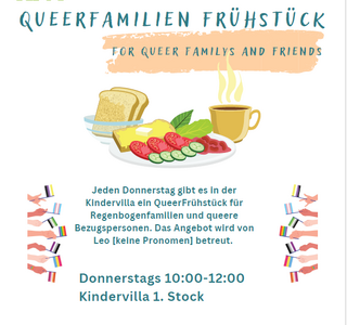 Queer-Brunch für alle Regenbogenfamilien mit Kindern von 0-6 Jahren. Wir stellen die Grundlagen für ein Frühstück zur Verfügung, ihr dürft gerne auch eigene Beiträge zum Frühstück mitbringen. Es gibt viel Platz zum Spielen, Krabbeln und Lesen. Das Angebot wird von Leo [keine Pronomen] betreut und findet jeden Donnerstag von 10-12 im 1. OG statt. Das Familienzentrum Kindervilla befindet sich hinter der großen Lucy-Lameck-Kita und ist auch durch die Baustelle etwas versteckt, aber ausgeschildert. Das Frühstück erhält sich durch die Spendenbeiträge der Eltern, bringt also gerne etwas Bargeld mit wenn ihr könnt. Wir freuen uns auf neue Familie und ein entspanntes Frühstück!