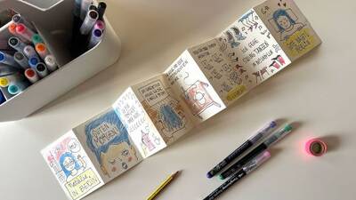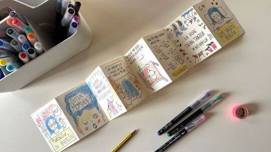 Zusammen gestalten wir Leporellos (Faltbücher) und erzählen darin unsere eigenen Alltagsgeschichten. Mit Zeichnungen, kurzen Texten und kreativen Ideen entstehen persönliche Comics über kleine und große Momente des Lebens. Schritt für Schritt entwickeln wir Bilderfolgen und setzen unsere Erlebnisse fantasievoll und individuell um.