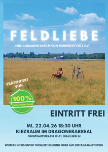 Der Dokumentarfilm FELDLIEBE erzählt die bewegende Geschichte des Tempelhofer Feldes – von der früheren Flughafenfläche zum lebendigen Freiraum mitten in Berlin. Ein Film über Gemeinschaft, Wandel und die Frage: Wie wollen wir in unserer Stadt zusammenleben und wie können wir sie weiterhin gemeinsam gestalten? Nach dem Film gibt es Raum für Austausch, Ideen und Gespräche. Bringt gerne Freunde und Freundinnen mit!