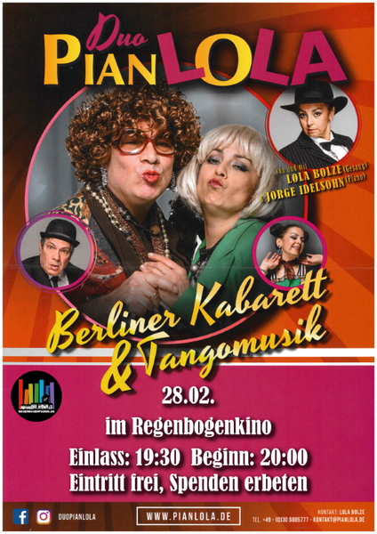 Das bekannte deutsch / argentinische Chansontheater Duo PIANLOLA besteht aus der Berlinerin Lola Bolze (Gesang) und dem Argentinier Jorge Idelsohn am Piano.