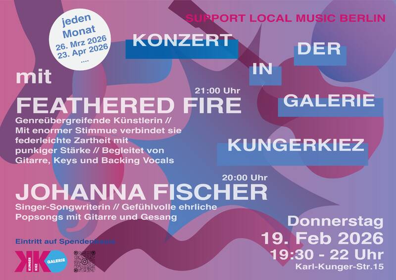 In Kooperation mit Support Local Music Berlin lädt die Galerie KungerKiez monatlich zu einem akustischen Abend mit talentierten Singer-/Songwriter*innen aus der Nachbarschaft und Berlin ein.
