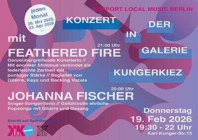 19:30 Uhr: Einlass & Öffnung der Bar 20 Uhr: Johanna Fischer 21 Uhr: Feathered Fire